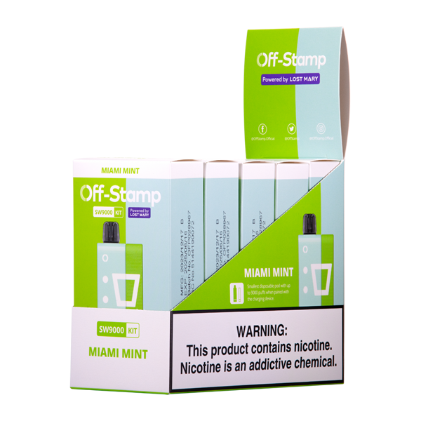 - Description: The Miami Mint Off Stamp SW9000 disposable vape kit includes an 800mAh charging dock and a detachable disposable vape with a capacity of 13ml and an integrated 200mAh battery. Note that the battery charging dock is required to recharge the disposable vape battery. The charging dock is reusable and contains most of the sophisticated electronics, reducing waste. Once you are in possession of the charging dock after your kit purchase, the prefilled disposable vape serves as cost-effective refill. With a nicotine strength of 5 percent and a puff count of 9000, the great flavor will keep adult vapers coming back.